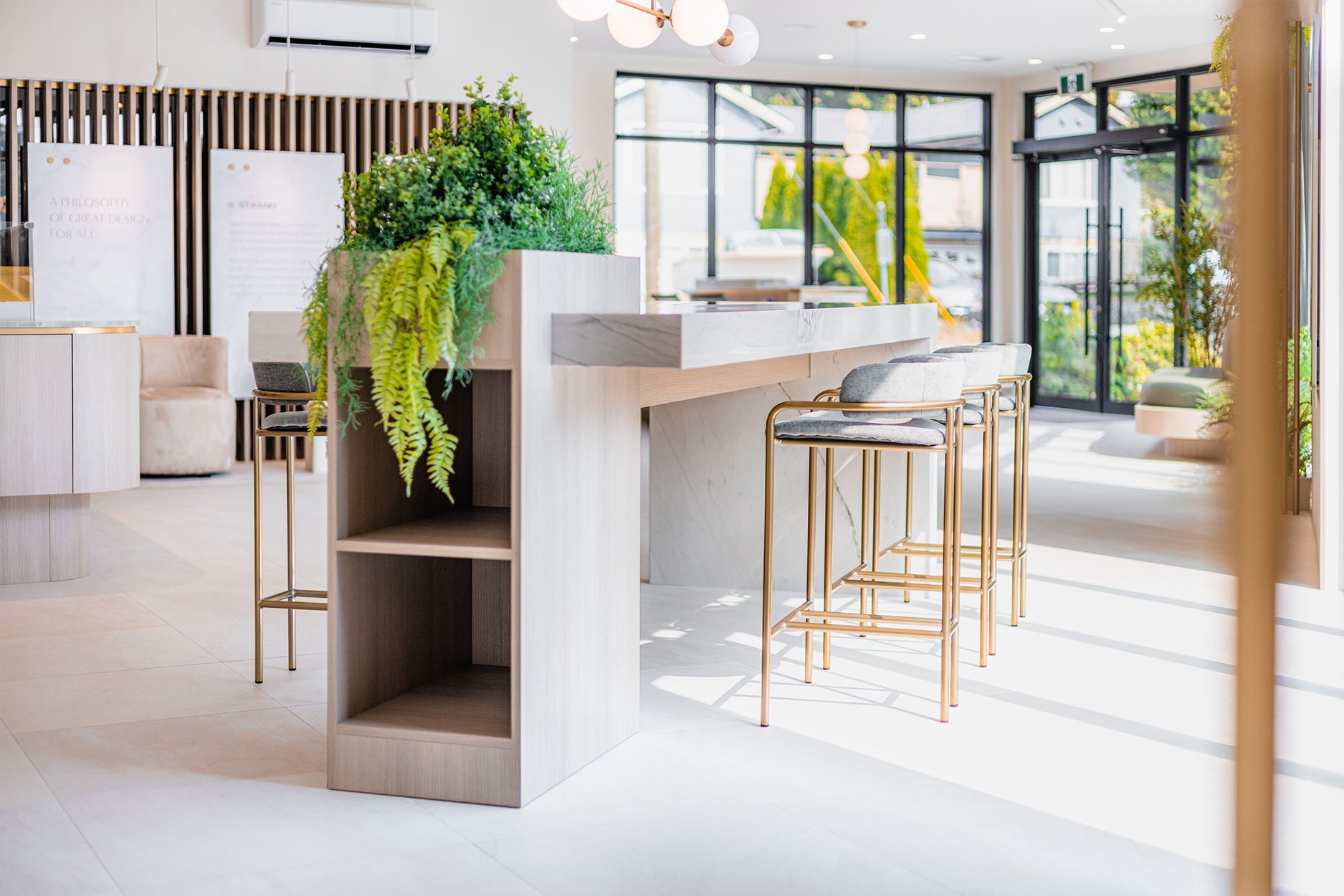Welcome to Alina Presentation Center location in West Coquitlam. Alina is a vision of balance in design, pairing a timeless aesthetic with luxurious modern details that capture a sense of sophistication and elegance. Peregrine completed an extensive package including the welcome desk and storage cabinets with arch, slat wall , wall panels, model table, searing table, wall shelving, and garden bench.